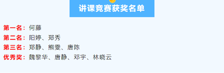 本次教学技能大赛共有10名选手参赛,在比赛过程中,参赛教师们教学内容熟悉,教学设计合理,教学方式丰富,现代教学手段运用娴熟,授课语言风趣幽默,讲解详略得当、清晰准确,教态大方得体,充分展现了各自扎实的教学基本功和教学特点,赢得了观众及评委们的一致肯定。