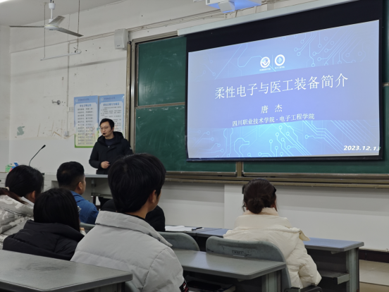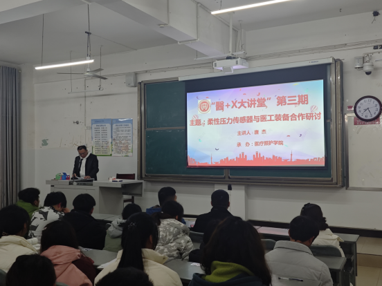 为更好满足人民日益增长的医疗卫生健康需求,推动医疗装备产业高质量发展。同时大力推进学院专业建设,进一步优化专业群结构,提升人才培养规模和质量。2023年12月12日晚,医疗照护学院“医+X大讲堂”第三期开讲。本期以柔性电子传感器与医工装备合作探讨为主题,特邀电子工程学院唐杰博士开展主题为柔性压力传感器与医工装备合作探讨知识讲座。医疗照护学院院长杜陵江、支部书记刘力以及23级医装专业全体师生聆听此次讲座。